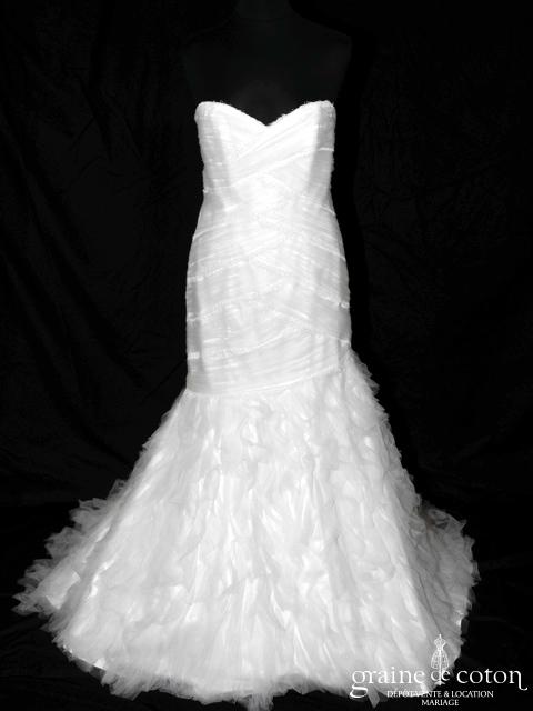 Robe une pièce en tulle ivoire : bustier drapé décolleté coeur avec galons de dentelle croisés en V. Jupe taille basse style fourreau en petits mouchoirs de tulle pour un volume tout en légèreté. Traîne. Belle coupe pour mariée fatale ;o) Jupon inclus.
