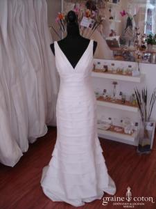 Ensemble trois pièces composé d’une jupe en dentelle, d’une veste à noeud façon « Chanel » et d’un bibi en dentelle ivoire. Idéale pour une tenue de mariage civil.