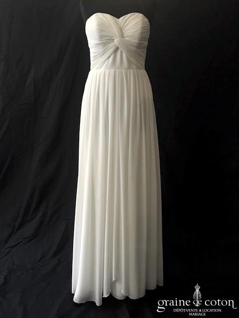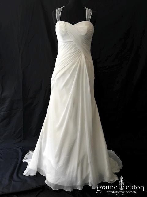 Robe une pièce en soie sauvage blanc drapée de tulle de soie ivoire. Bustier empire avec bretelles formant un décolleté en V, drapé à la taille. Jupe taille basse avec …