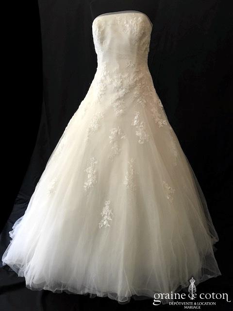 Robe une pièce ivoire clair : bustier recouvert d’un tulle brodé façon dentelle avec petites manches, dos ouvert fermé d’un ruban et d’un bouton. Taille ceinturée. Jupe fluide en mousseline …