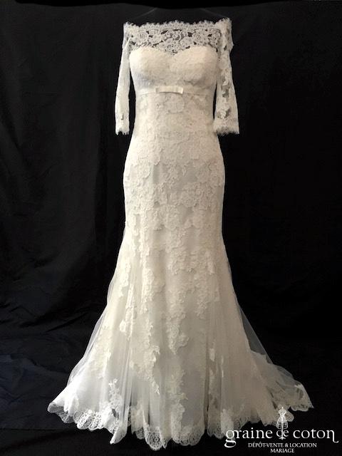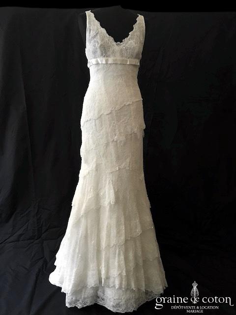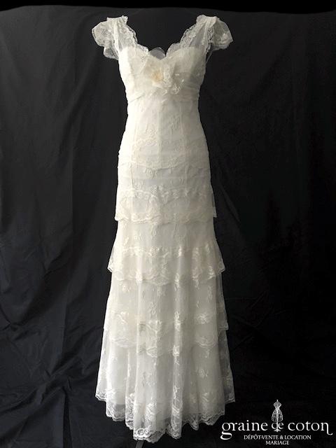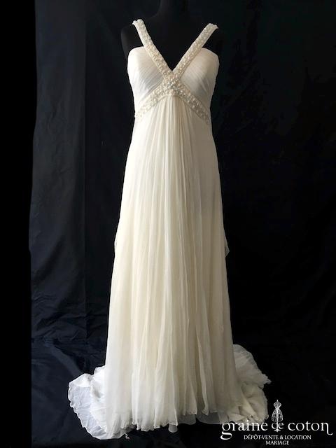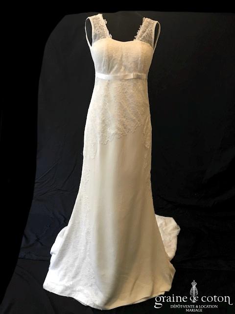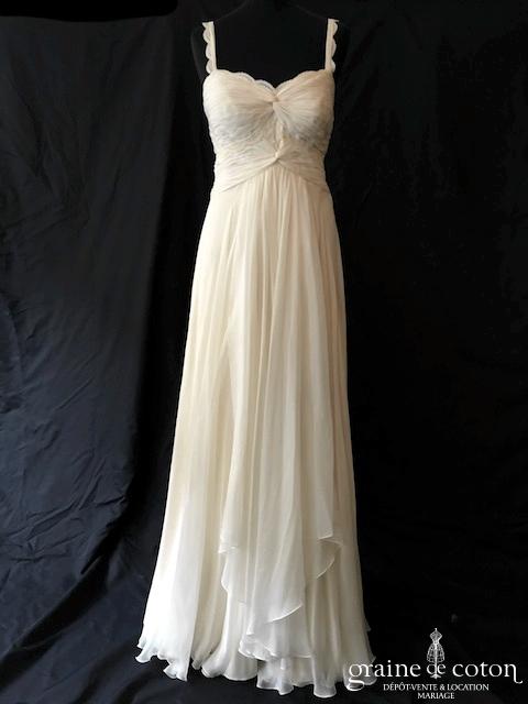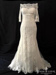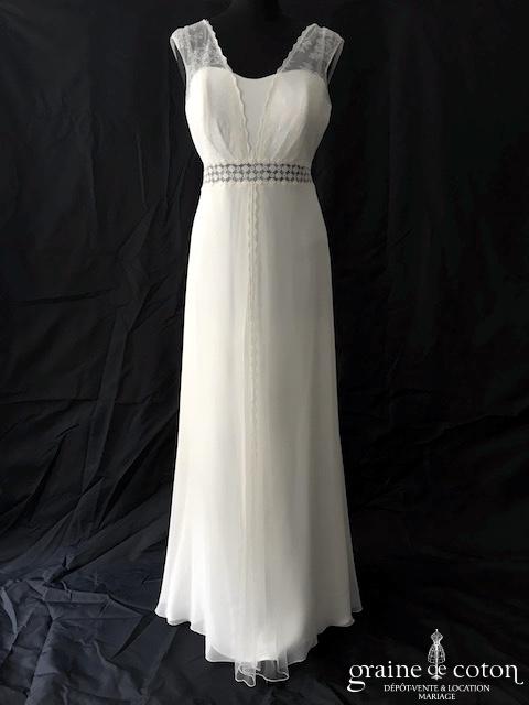 Robe une pièce tout en tulle fluide ivoire clair : bustier coeur recouvert d’un tulle perlé, dos en V boutonné et petites manches. Jupe taille haute ceinturée, en tulle fluide, …