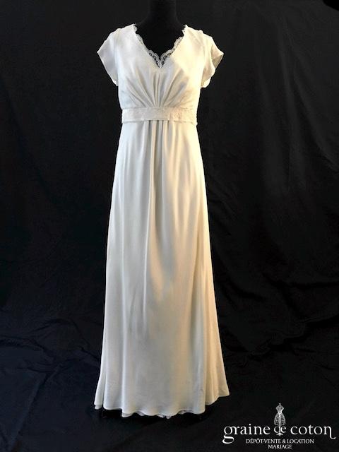 Robe une pièce en satin blanc : bustier empire avec fines bretelles et manches tombantes sur les épaules en mousseline fluide. Strass fleur et large ceinture bleu roi pour souligner …