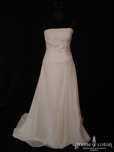 Robe une pièce ivoire blanche : bustier plissé en taffetas, dos lacé. 2 fleurs en perles et tissu qui peuvent se retirer ornent la taille. Jupe taille basse en mouchoirs …