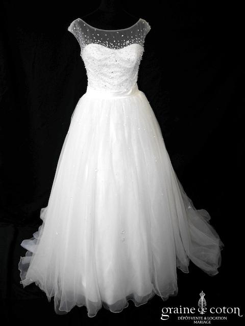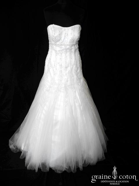 Robe une pièce ivoire clair : bustier coeur orné de perles et de dentelle, dos lacé. Jupe taille basse en mouchoirs de tulle irisé, beau volume. Traîne se relevant par …