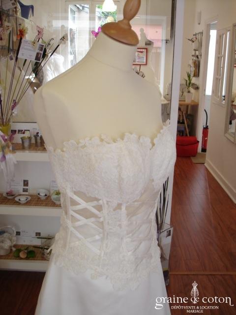 Robe une pièce ivoire clair : bustier avec larges bretelles et manches amovibles tout en dentelle. Dos lacé. Jupe en taffetas avec effets de relevés, petite traîne. Belles matières, seyante …