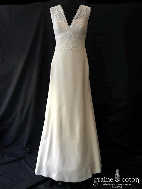 Robe une pièce ivoire clair : top en guipure avec décolleté V et manches 3/4, dos nu. Jupe taille haute en mousseline fluide épurée, traîne. Légère et seyante.