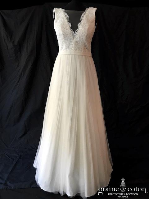 Robe une pièce ivoire clair : top en dentelle avec décolleté en V, petites manches et dos nu. Jupe fluide taille haute en mousseline épurée, traîne. Bohème champêtre.