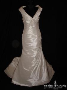 Robe une pièce ivoire clair : top en guipure avec profond décolleté en V, dos nu et petites manches. Jupe taille haute en mousseline fluide, petite traîne pouvant se relever …