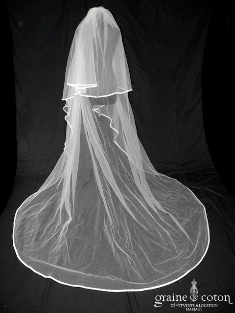 Voile long de 2 mètres 50 en tulle ivoire bordé d’un biais de satin