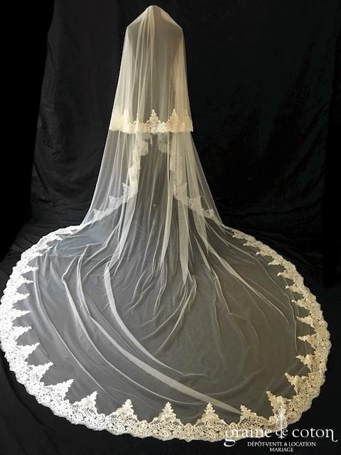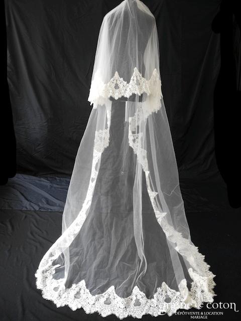 Voile long de 2 mètres en tulle ivoire clair bordé de fine dentelle de Chantilly