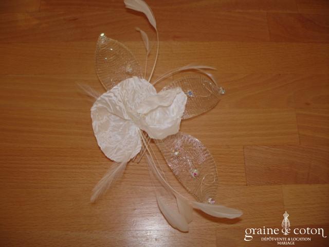 Peigne à cheveux avec pétales d’organza et plumes ivoire.