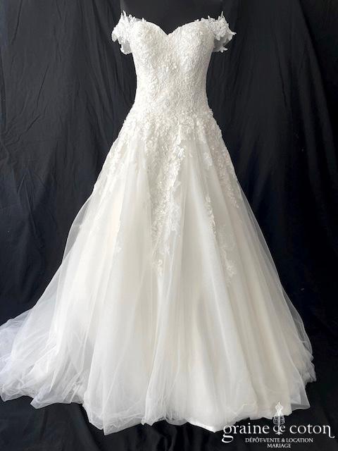 Robe demoiselle d’honneur avec bustier roses en organza et jupe en tulle plumetis blanc. Ceinture noire à la taille, à nouer dans le dos.
