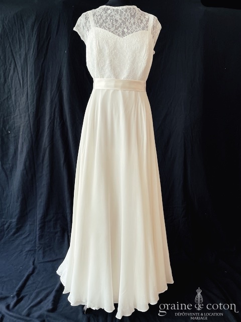 Boléro en organza de soie ivoire clair avec guipure de dentelle, ouvert sur l’avant. Idéal pour couvrir les épaules sans cacher la robe.