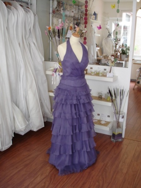 Julie avait repéré une robe de soirée violette pour son mariage mais elle restait partagée sur le fait d’avoir une robe courte idéale pour un mariage civil et une robe longue plus habillée. Qu’à cela ne tienne, on a gardé les deux options ;o) Grâce à un système de ruban pressions caché sous les volants, Julie peut décider d’avoir une robe courte légère ou bien une robe longue très classe !