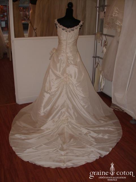 Robe une pièce ivoire avec effet drapé, petites manches tombantes en dentelle transparente et grande traîne.