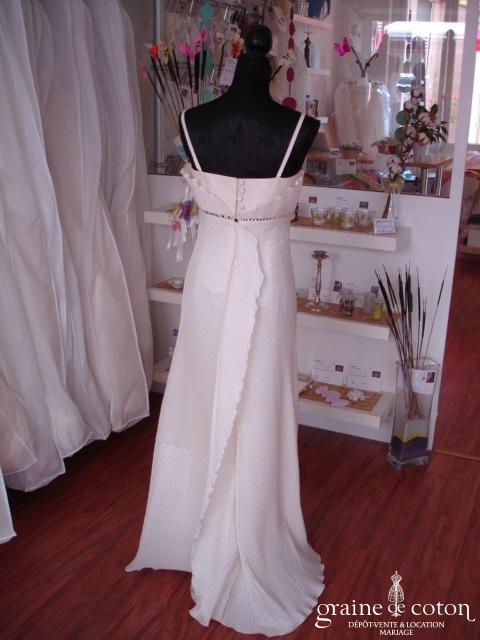Robe une pièce ivoire, taille empire : magnifique tissu plissé, ligne sobre, extrêmement élégante. Mitaines longues plissées assorties. Fines bretelles. Un beau modèle de créateur.