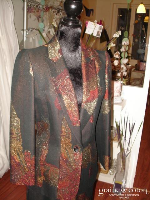Tailleur veste cintrée manches longues et jupe aux genoux droite : coton noir (51%) avec motifs rouges et pailletés dorés. Très habillé, belles matières, idéal pour les mamans et belles-mamans des mariés !