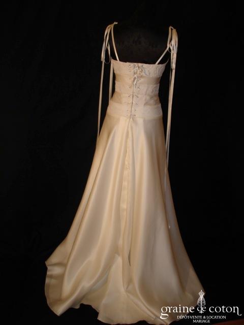 Robe une pièce ivoire : bustier en bandes horizontales de satin, soie sauvage, dentelle de calais et dentelle de chantilly, jupe trapèze en triple organza de soie. Dos lacé, bretelles ajustables grâce à un système de longs rubans de satin retombant sur la robe. Matières de grande qualité et coupe originale.