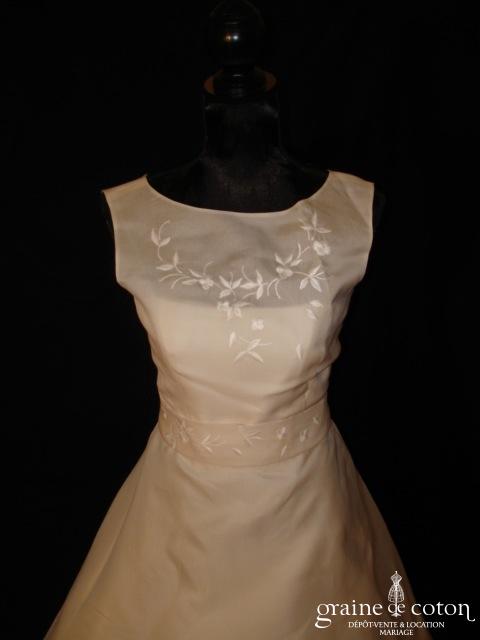 Robe une pièce en gaze de soie ivoire : bustier avec bretelles, décolleté dos en V et fines broderies de fleurs sur le devant. Jupe trapèze évasée : large ceinture à la taille qui se noue derrière et retombe en 2 larges pans sur la jupe. Modèle hors du commun. Jupon et housse inclus.