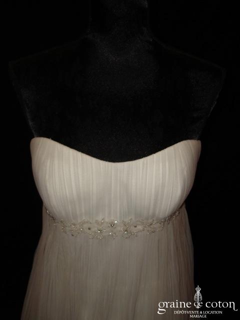 Robe une pièce en tulle plissé ivoire : taille empire soulignée par un ruban de fines perles transparentes. Volant de tulle sur le bas de la robe, traîne pouvant se remonter par un système de crochet. Sobre et élégant. Housse incluse.