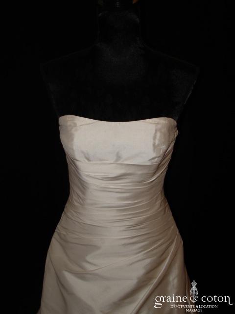 Robe une pièce en soie sauvage : bustier drapé, jupe trapèze épurée et dos longé de petits boutons jusqu’au bout de la traîne. L’élégance de la simplicité. Housse et jupon inclus.