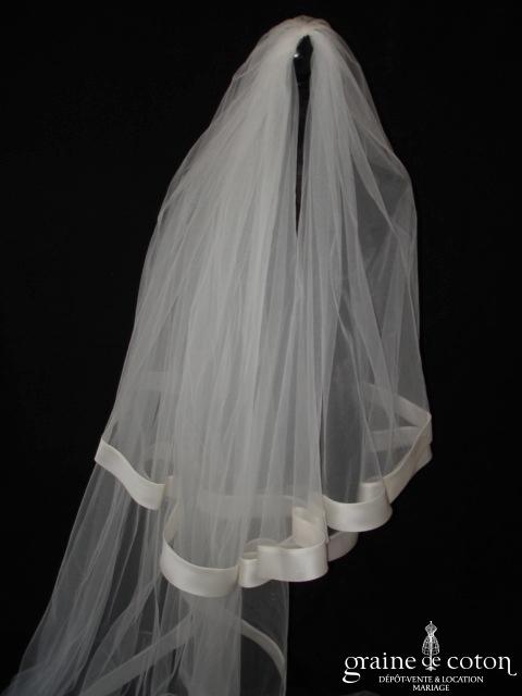 Pronovias – Voile long de 3,75 mètres en tulle ivoire avec large biais d’organza de soie
