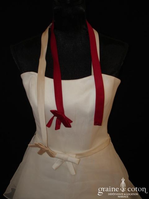 Robe une pièce en satin et organza ivoire : bustier coeur, taille ceinturée. La ceinture existe en 3 couleurs que vous pouvez alterner au cours de la soirée : ivoire, champagne et rouge. Jupe avec larges volants d’organza et traîne.
