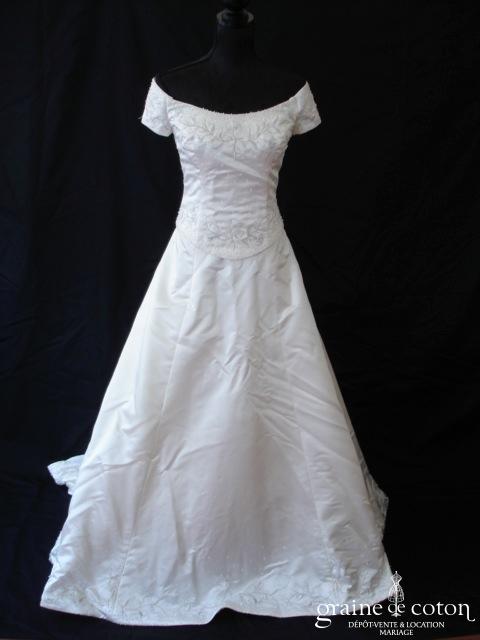 Robe une pièce en satin ivoire : bustier avec petites manches aux épaules, bustier brodé de perles et de fleurs blanches et argentées, jupe avec rappel des motifs du bustier. Longue traîne amovible.