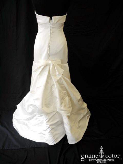 Robe une pièce en satin ivoire : bustier taille empire avec large revers, boutonné dans le dos. Jupe trapèze devant, avec plis et gros noeud à l’arrière. Traîne pouvant se relever par un système de 6 rubans. Belle coupe. Housse incluse. Peut se porter avec le boléro long en dentelle référence 2202.