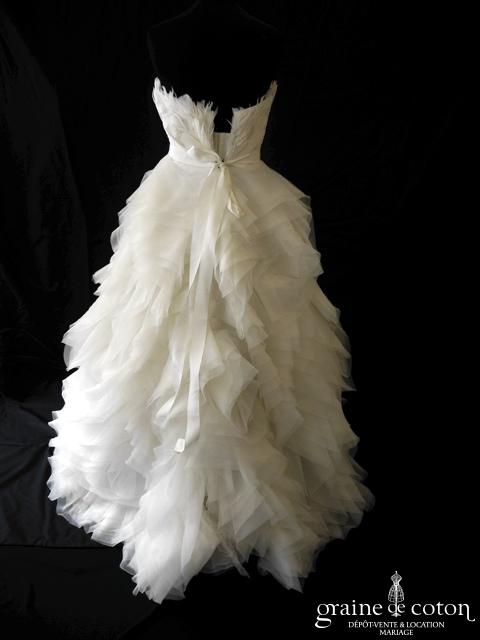 Robe une pièce ivoire clair : bustier recouvert de plumes, ceinture strass à la taille. Jupe volumineuse et légère en mouchoirs de tulle et d’organza. Un modèle original et féerique !