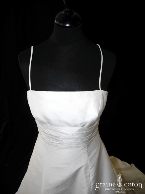 Robe bustier en soie sauvage ivoire : bustier avec fines bretelles pouvant être portées ou non, jupe trapèze avec traîne. Une ceinture se noue à la taille façon gros noeud derrière ou côté, ou bien en noeud sans boucle. Actuellement petit galon de dentelle verte souligne la taille empire : il peut se changer ou se retirer. Épurée et élégante. Boléro référence 2080 idéalement assorti. Housse incluse.