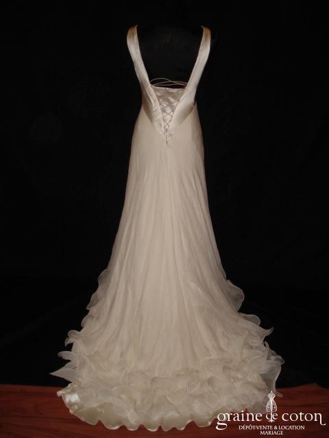 Robe une pièce ivoire : bustier empire en satin de soie avec bretelles et décolleté drapé en V, laçage dos. Jupe fluide en mousseline de soie, finitions petites volutes. Belles matières et beau tombé, un modèle original et très élégant. Housse incluse.