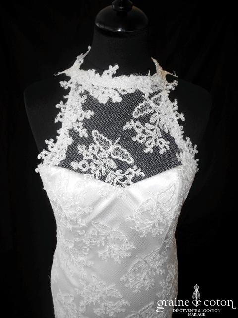 Robe en deux parties : sous robe bustier en satin fluide. Sur robe en dentelle montant jusqu’au cou, coupe droite avec petite traîne pouvant se relever. Grande élégance, belles matières.