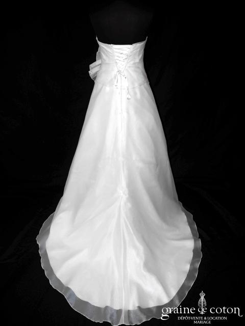 Robe une pièce en organza ivoire clair : bustier drapé à la taille avec fleurs en organza et satin, dos lacé. Jupe trapèze légère, traîne. Une robe élégante et facile à porter. Housse incluse.
