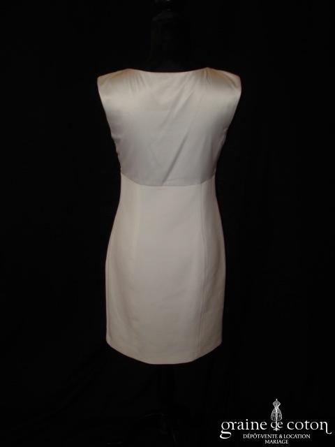 Robe une pièce ivoire clair courte (au genou) : bustier avec bretelles, recouvert de satin plissé à l’encolure. Jupe droite près du corps. Idéale pour une cérémonie civile.
