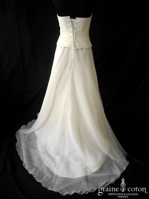 Robe deux pièces en organza ivoire : bustier drapé légèrement coeur, orné de perles le long du décolleté, dos lacé. Jupe fluide épurée en organza, petite traîne. Souple et seyante. Housse et jupon inclus.