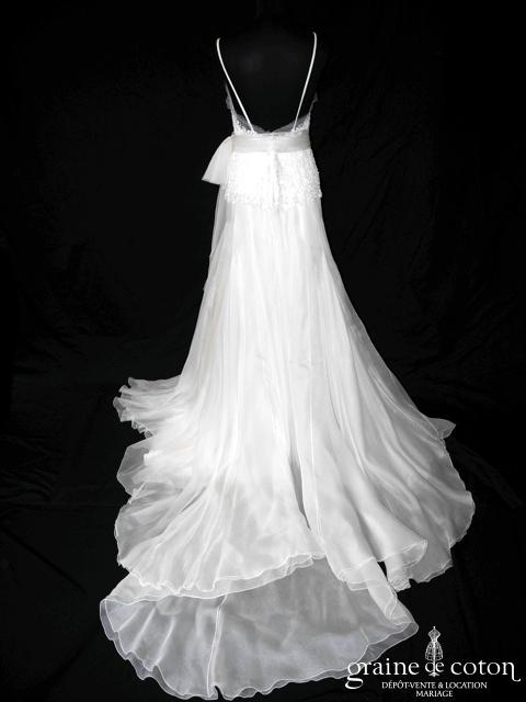 Robe une pièce ivoire : bustier à fines bretelles entièrement et délicatement perlé, dos nu. Ceinture en organza amovible à la taille avec noeud. Jupe sirène en gaze de soie avec traîne. Grande élégance, beau tombé. Housse incluse.