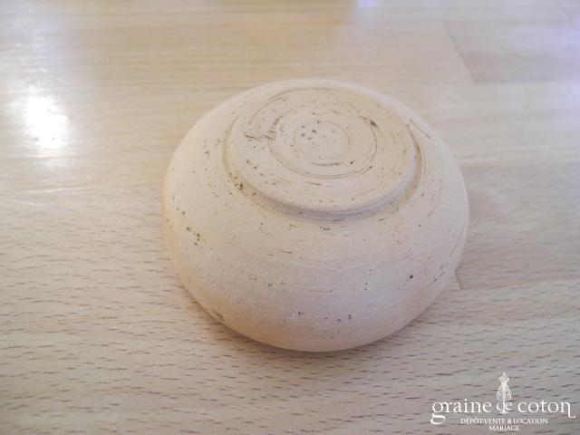 Petite poterie ronde remplie de graines. Diamètre : 7 cm.