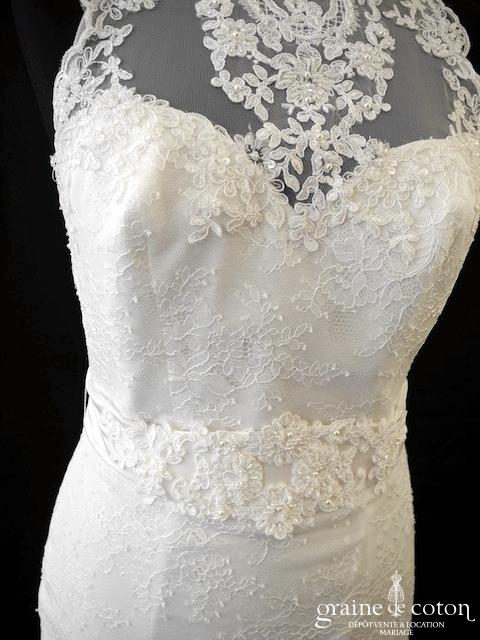 Robe une pièce tout en dentelle ivoire clair : bustier coeur avec décolleté recouvert de tulle dentelé, dos tout en tulle transparnet, boutonné. Taille marquée par une ceinture amovible. Jupe sirène avec volants de dentelle en biais, petite traîne. Légère et lumineuse.