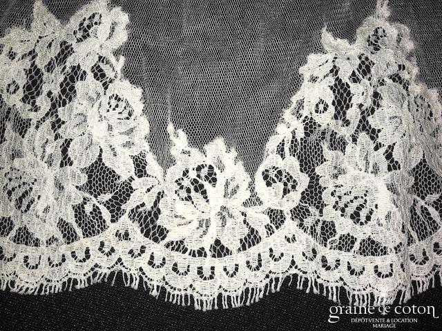 Voile long de 3 mètres en tulle de soie fluide ivoire bordé d’une dentelle de Calais. Magnifique pièce, très délicate. A porter en voile classique ou à nouer façon bohème.