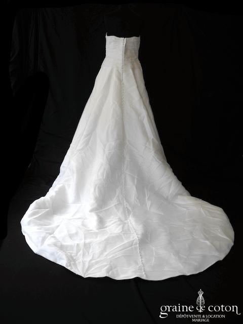 Robe une pièce tout en organza : bustier drapé asymétrique, rebrodé de façon très discrète de fines perles pour renvoyer la lumière. Dos boutonné, bretelle tour de cou amovible. Jupe trapèze évasée avec traîne Étole incluse. Seyante et classe.