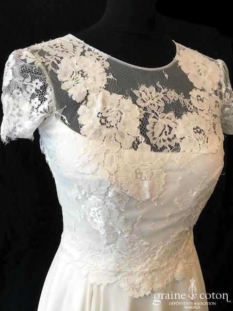 Robe une pièce ivoire clair : top en dentelle avec petites manches, dos nu avec fermeture petits boutons. Jupe taille haute en mousseline fluide avec traîne. Pure, chic et bohème.