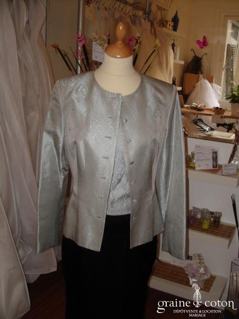 Veste gris et verte, cintrée, assortie au bustier référence 370. Très habillée, peut se porter sur jupe ou pantalon.