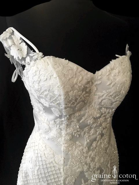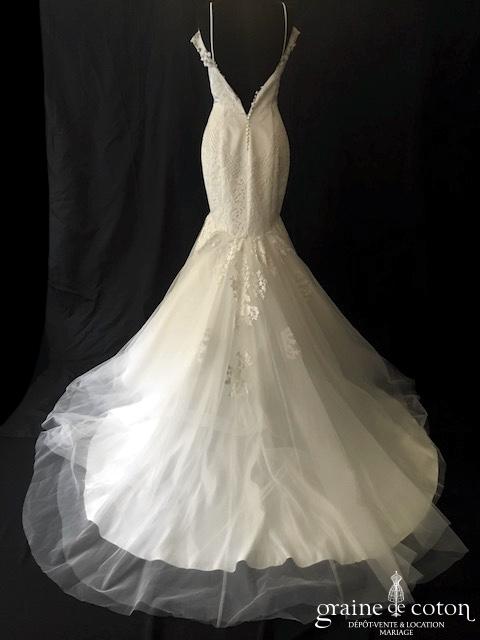 Robe une pièce tout en guipure ivoire clair : top avec manchettes sur les épaules, décolleté coeur. Dos largement échancré. Jupe sirène très marquée largement évasée avec traîne. Magnifique, classe et glamour.