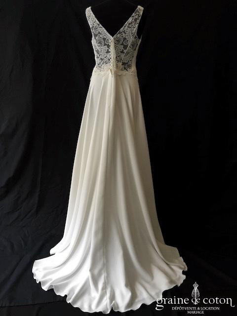 Robe une pièce ivoire clair : top en dentelle avec bretelles, décolletés devant et dos en V, dos boutonné. Jupe taille haute en mousseline fluide, petite traîne pouvant se relever. Fraîche, légère et lumineuse !