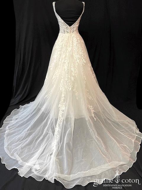 Robe une pièce ivoire clair : top en dentelle avec bretelles et décolleté en V, dos nu. Jupe taille haute évasée en tulle parsemée de la même dentelle que le haut, petite traîne. Princesse bohème.