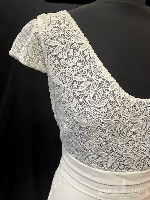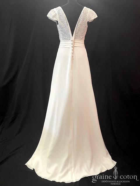 Robe une pièce ivoire clair : top en guipure avec encolure V et dos nu, petites manches. Jupe taille haute ceinturée en crêpe fin, tombé fluide avec petite traîne. Bohème champêtre, lumineuse et légère !