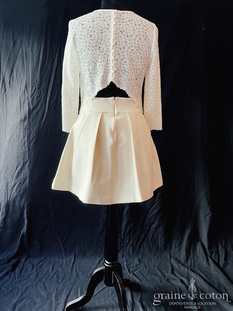 Robe en deux pièces : top en dentelle, manches 3/4 et dos bouton ouvert sur le bas. Jupe patineuse taille haute ivoire avec poches, belle tenue. Un ensemble original et facile à vivre, idéal en seconde tenue !