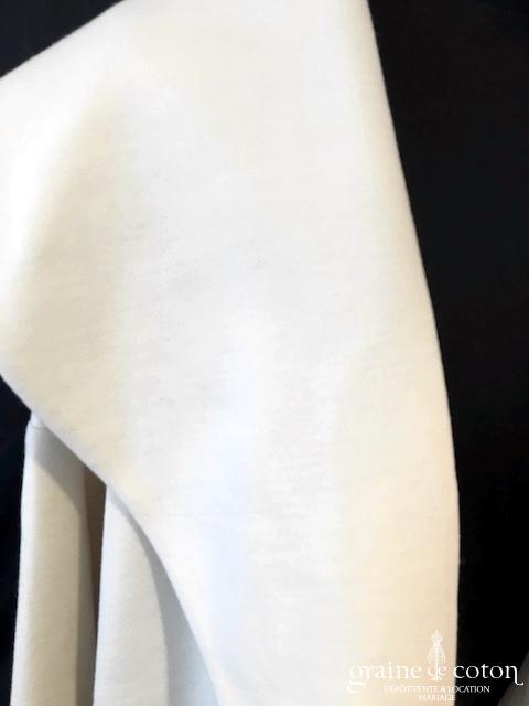Manteau mi long en laine ivoire, bordé d’un double biais noir, dos au point de croix. Une magnifique pièce pour habiller vos robes en mi saison !