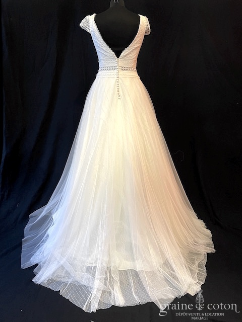 Robe une pièce ivoire clair : top décolleté en V en dentelle avec petites manches, beau dos nu. Jupe taille haute en tulle plumetis souple, petite traîne pouvant se relever. Bohème champêtre : seyante et lumineuse !
